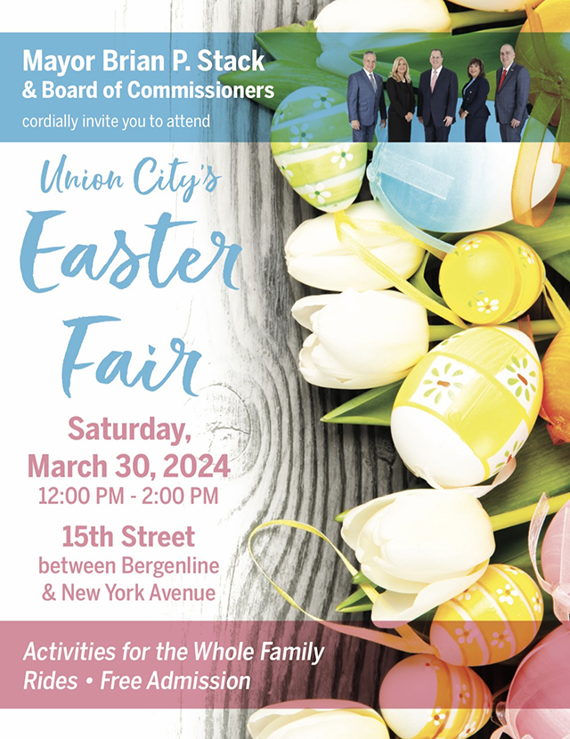 Posted March 05, 2024Mayor Brian P. Stack and Board of Commissioners cordially invite you to attend Union City’s Easter Fair on Saturday, March 30, 2024 on 15th Street, between Bergenline & New York Avenues, from 12 to 2 p.m. Come and enjoy activities for the whole family. Admission is free.