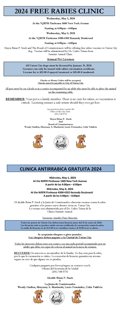 Mayor Brian P. Stack and The Board of Commissioners will be offering free rabies vaccines to Union City dog. Vaccine will be administered by Dr. Carlos Triana from Summit Animal Clinic.