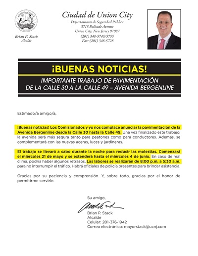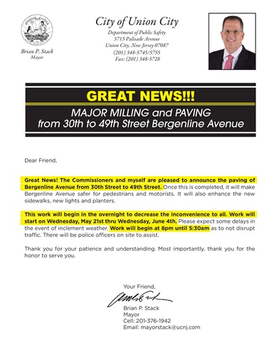 Great News! The Commissioners and myself are pleased to announce the paving of Bergenline Avenue from 30th Street to 49th Street. Once this is completed, it will make Bergenline Avenue safer for pedestrians and motorists. It will also enhance the new sidewalks, new lights and planters.