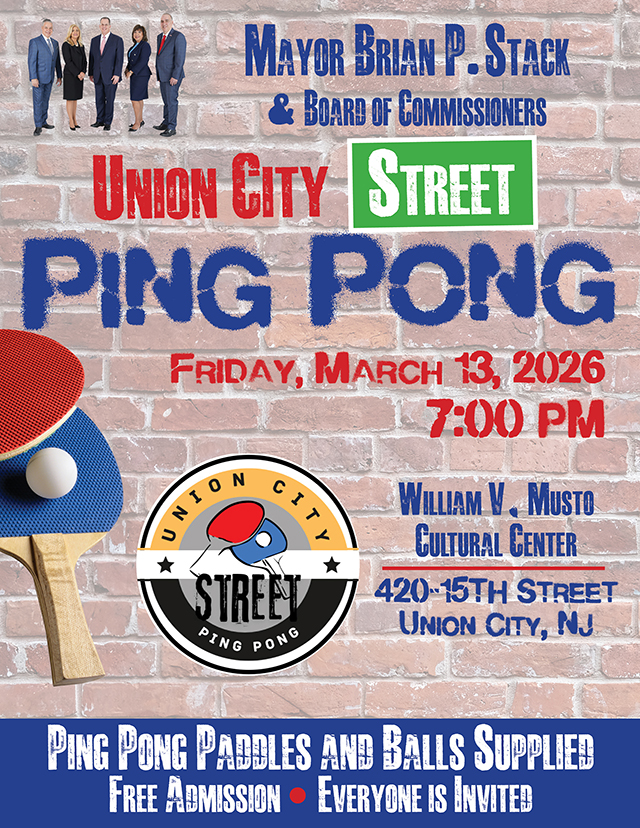Posted March 11, 2026Mayor Brian P. Stack and the Board of Commissioners present Union City Street Ping Pong on Friday, March 13, 2026 at the William V. Musto Cultural Center, 420 15th St., at 7 p.m. Ping pong paddles and balls supplied.